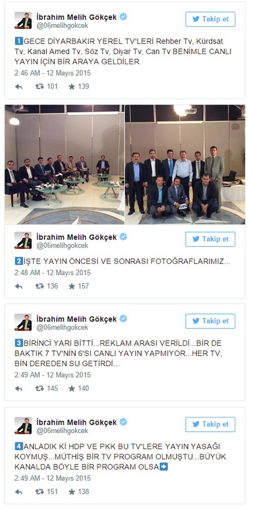 Genel seçimler öncesi Türkiye üzerine oynanan oyunları anlatmak adına televizyon programlarına konuk olan Gökçek, sosyal paylaşım sitesi twitter üzerinden şu açıklamayı yaptı; “Gece Diyarbakıryerel TV'leri Rehber Tv, Kürdsat Tv, Kanal Amed Tv, Söz Tv, Diyar Tv, Can Tv benimle canlı yayın için bir araya geldiler. Birinci yarı bitti, reklam arası verildi. Bir de baktık 7 TV'nin 6'sı canlı yayın yapmıyor. Her TV, bin dereden su getirdi. Anladık ki HDP ve PKK bu TV'lere yayın yasağı koymuş”