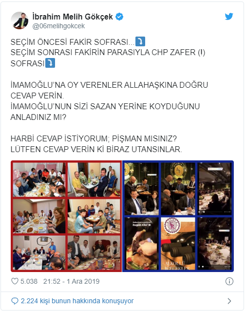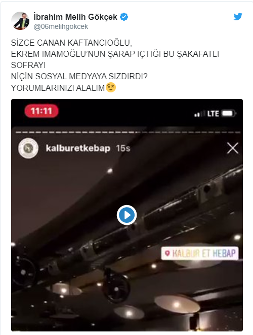 Ankara Büyükşehir Belediyesi eski Başkanı Melih Gökçek, seçim sürecinde dindar görüntüsü sergileyerek oy toplayan CHP'li İstanbul Büyükşehir Belediye (İBB) Başkanı Ekrem İmamoğlu ile CHP İstanbul İl Başkanı Canan Kaftancıoğlu'nun şarap içtiğinin görüldüğü bir sofrayı “Sizce Canan Kaftancıoğlu, Ekrem İmamoğlu’nun şarap içtiği bu şatafatlı sofrayı niçin sosyal medyaya sızdırdı” mesajıyla paylaştı.