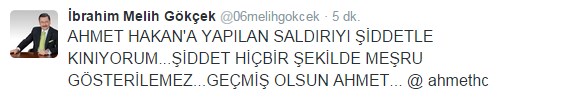 Ankara Büyükşehir Belediye Başkanı Melih Gökçek, Hürriyet gazetesi yazarı Ahmet Hakan'a yapılan saldırıyı sosyal medya üzerinden kınadı.