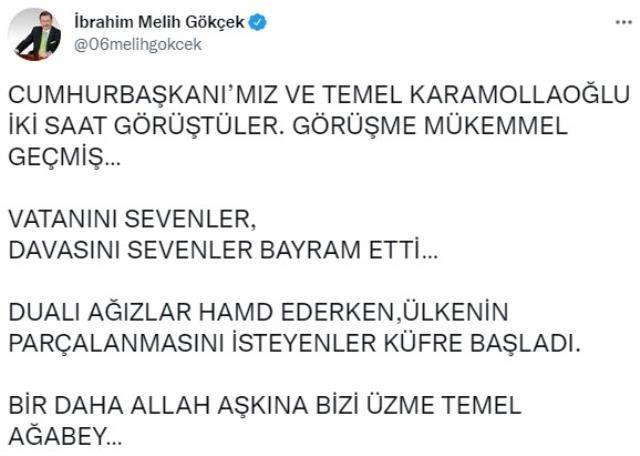 Ankara Büyükşehir Belediyesi eski Başkanı Melih Gökçek, Twitter'dan yaptığı paylaşımda, "Cumhurbaşkanı'mız ve Temel Karamollaoğlu iki saat görüştüler. Görüşme mükemmel geçmiş… Vatanını sevenler, davasını sevenler bayram etti… Dualı ağızlar hamdederken, ülkenin parçalanmasını isteyenler küfre başladı. Bir daha Allah aşkına bizi üzme Temel Ağabey…" ifadelerini kullandı.