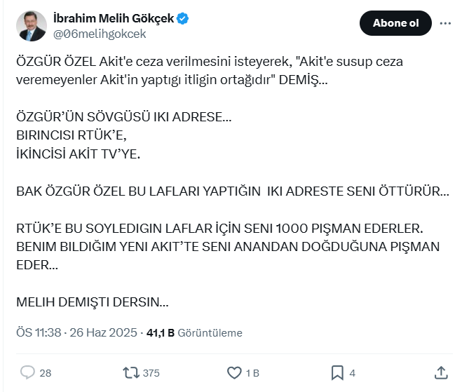 Özgür Özel Akit’e ceza verilmesini isteyerek, “Akit'e susup ceza veremeyenler Akit'in yaptığı itliğin ortağıdır” demiş… Özgür’ün sövgüsü iki adrese… Birincisi RTÜK’e, ikincisi Akit TV’ye. Bak Özgür Özel bu lafları yaptığın iki adres de seni öttürür… RTÜK’e bu söylediğin laflar için seni 1000 pişman ederler. Benim bildiğim Yeni Akit de seni anandan doğduğuna pişman eder… Melih demişti dersin…