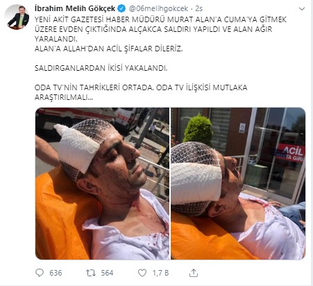 Melih Gökçek, yaptığı paylaşımda "Yeni Akit Gazetesi Haber Müdür Murat Alan'a, Cuma'ya gitmek üzere evden çıktığında alçakça saldırı yapıldı ve Alan ağır yaralandı. Alan'a Allah'tan acil şifalar dileriz. Saldırganlardan ikisi yakalandı. Odatv'nin tahrikleri ortada, Odatv ilişkisi mutlaka araştırılmalı" ifadelerini kullandı.