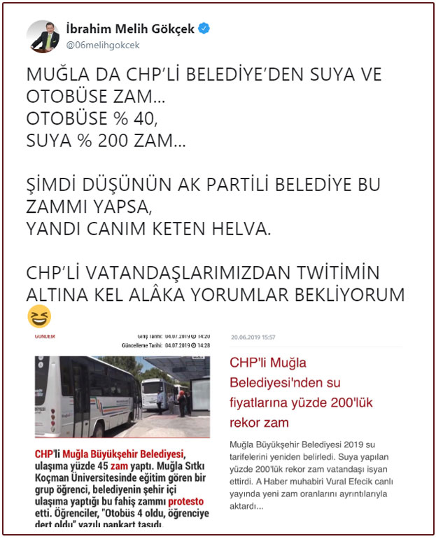 Ankara Büyükşehir Belediyesi eski Başkanı AK Partili Melih Gökçek, CHP’li Muğla Belediyesi’nin ulaşıma yüzde 45, suya yüzde 200 zam yapması hakkında çok konuşulan bir yorumda bulundu.