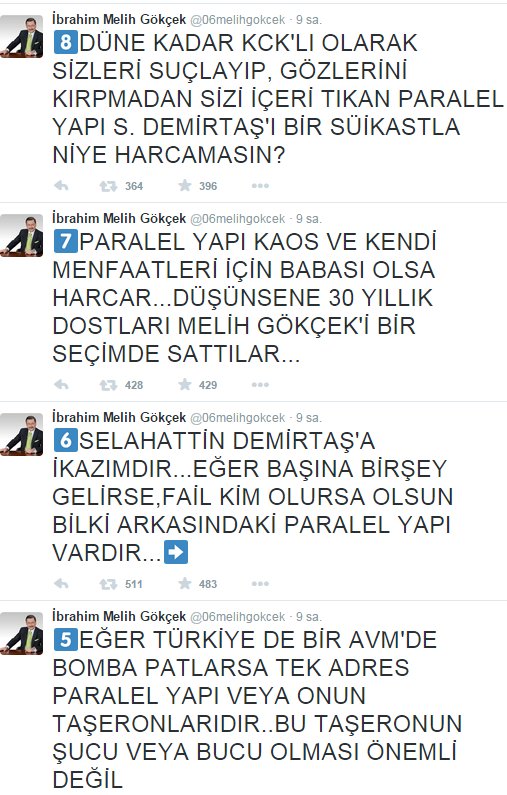 Ankara Büyükşehir Belediye Başkanı Melih Gökçek, HDP Eş Genel Başkanı Selahattin Demirtaş ile ilgili olay yaratacak bir iddiada bulundu. Gökçek, Selahattin Demirtaş'ın suikaste uğrayacağını, bunun da "paralel yapı" tarafından yapılacağını iddia etti. Gökçek, "Selahattin Demirtaş'a ikazımdır, eğer başına bir şey gelirse, fail kim olursa olsun bilki arkasındaki paralel yapı vardır" dedi.