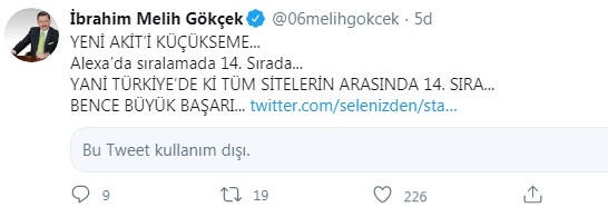 Ankara Büyükşehir Belediye eski Başkanı Gökçek, bir sosyal medya kullanıcısına, tweetini paylaşarak, "Yeni Akit'i küçümseme... Alexa'da sıralamada 14. sırada.. Yani Türkiye'deki tüm sitelerin arasında 14. sıra... Bence büyük başarı." ifadelerini kullandı.