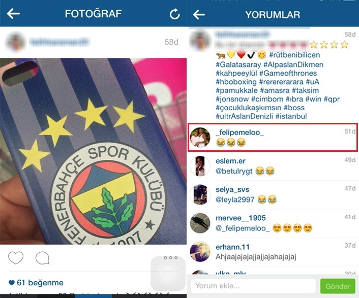Galatasaray'ın Brezilyalı futbolcusu Felipe Melo, Instagram hesabında, Fenerbahçe'nin logosunun üzerinde 4 yıldızın yer aldığı bir gönderiye yorum yaptı. Herhangi bir cümle yazmayan Melo, yaptığı yorumda 'kahkaha' smiley'i kullandı. Melo'nun bu hareketi, Fenerbahçelileri kızdırdı.