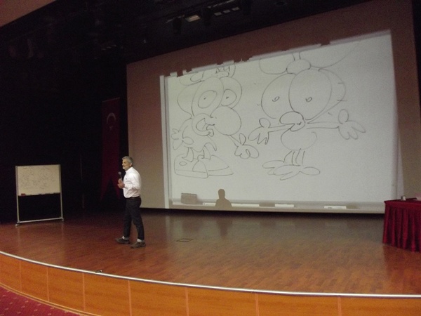 Sempatik tavırları ve samimiyetiyle dikkat çeken Memecan kendi yaşamından kesitler sunarak genç beyinlere karikatüristliği anlattı. Ünlü karikatürist konuşmasına mühendis, doktor, vb. olmanın önemli olduğunu ancak karikatür çizebilen mühendis, doktor olunduğu zaman hayatın çok daha güzel olacağından bahsederek başladı.