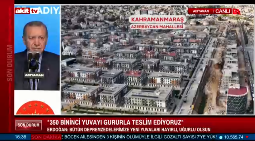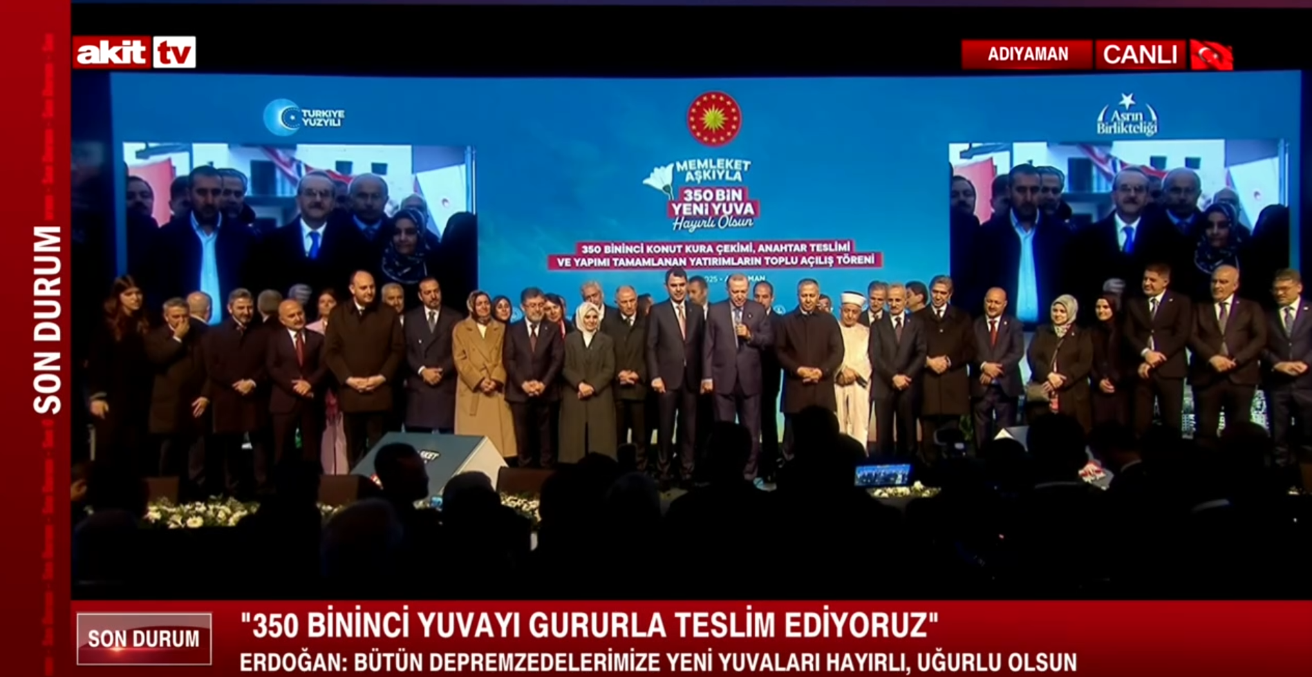 Deprem bölgesindeki asrın ihya çalışmaları kapsamında 350 bininci konutun teslimi, Başkan Recep Tayyip Erdoğan'ın katılacağı törenle, ağır yıkımın izlerinin silindiği Adıyaman'da, "Memleket Aşkıyla 350 Bin Yuva Tamam" sloganıyla düzenlenecek. Cumhurbaşkanlığı İletişim Başkanlığı, Başkan Recep Tayyip Erdoğan'ın katılımıyla Adıyaman'da yapılacak törenle deprem bölgesinde teslim edilen bağımsız bölüm sayısının 350 bin 178'e yükseleceğini bildirdi.