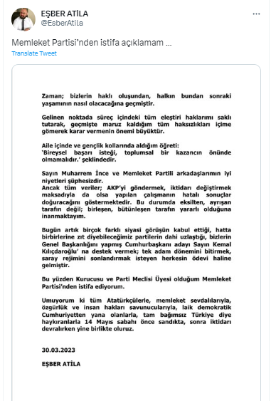 Kurucusu ve Parti Meclisi Üyesi olduğum Memleket Partisi'nden istifa ediyorum. Umuyorum ki tüm Atatürkçülerle, memleket sevdalılarıyla, özgürlük ve insan hakları savunucularıyla, laik demokratik Cumhuriyetten yana olanlarla, tam bağımsız Türkiye diye haykıranlarla 14 Mayıs sabahı önce sandıkta, sonra iktidarı devralırken yine birlikte oluruz.
