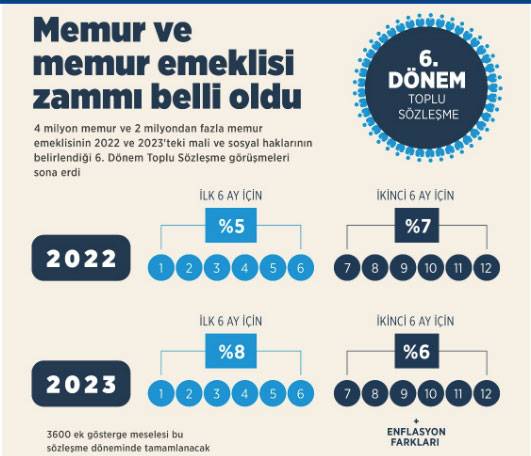 Toplam 6.4 milyon memur ve memur emeklisini kapsayan toplu sözleşmede gelecek yılın ilk yarısı için yüzde 5+enflasyon farkı, ikinci yarısı için de yüzde 7+enflasyon farkı zam yapıldı. 2023'te de yüzde 8+6 zam ve enflasyon farkı olmak üzere toplamda yüzde 14'lük bir artış yapılması öngörüldü.