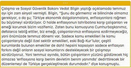 Erdoğan yaptığı açıklamada ise; Herkesin gelirini arttıracak düzenlemeler hazırlıyoruz demiştir. Çalışma ve Sosyal Güvenlik Bakanı Vedat Bilgin’de Erdoğan’ın yapmış olduğu açıklamalara yakın ifadelerde bulunarak Temmuz zammı ile beraber sosyal refah artışları üzerindeki açıklamarını dile getirdi. Emeklilere ve memurlara yapılacak temmuz zamları tam olarak TÜİK’in haziran ayı enflasyon rakamlarını açıklamasının ardından belirlenecek.