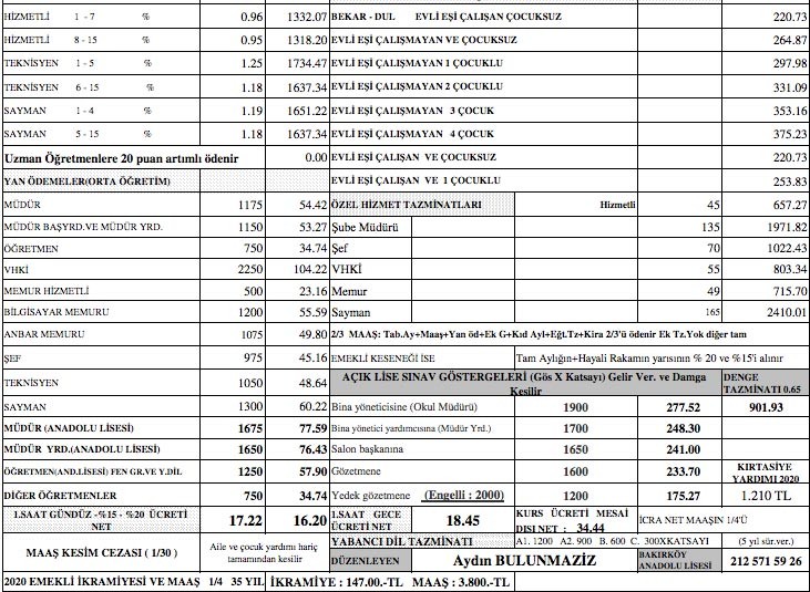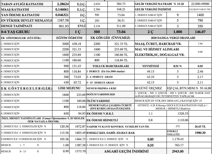 657 sayılı Devlet Memurları Kanunu’nda (Değişik: 23/2/1995 - KHK-547/9 md.) Bu Kanun gereğince ödenecek aylık, taban aylığı, kıdem aylığı zam ve tazminatlar ile diğer ödemeler toplamının brüt tutarı, bulunulan yerde İş Kanunu gereğince işçiler için tespit olunan asgari ücretin aylık tutarından az olamaz: az olması halinde, aradaki fark memurun diğer özlük hakları ile ilgilendirilmeksizin tazminat olarak ödenir." hükmü yer almaktadır. Memur maaş katsayısı; 657 sayılı Devlet Memurları Kanununun 154 üncü maddesine göre aylık gösterge tablosunda yer alan rakamlar ile ek gösterge ve kıdem aylığı gösterge rakamlarının aylık tutarlarına çevrilmesinde kullanılan katsayıya aylık katsayı, memuriyet taban aylığı ile çarpılan katsayıya da taban aylık katsayısı adı verilmektedir. Kamuajans’ın haberine göre, 2020 taban aylığı, ek ödeme oranları şöyle: