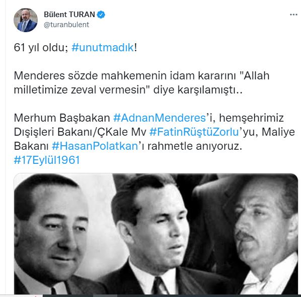 AK Parti Grup Başkanvekili, Çanakkale Milletvekili Bülent Turan, “61 yıl oldu; #unutmadık! Menderes sözde mahkemenin idam kararını ‘Allah milletimize zeval vermesin’ diye karşılamıştı. Merhum Başbakan #AdnanMenderes’i, hemşehrimiz Dışişleri Bakanı/ÇanakKale Mv #FatinRüştüZorlu’yu, Maliye Bakanı #HasanPolatkan’ı rahmetle anıyoruz” dedi.