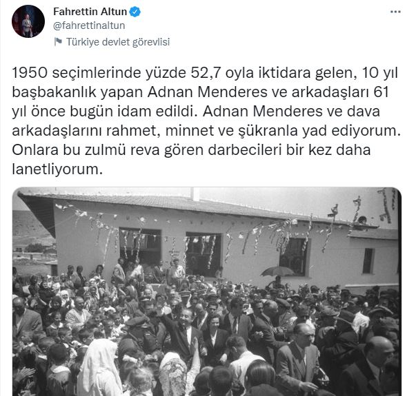 İletişim Başkanı Fahrettin Altun, “1950 seçimlerinde yüzde 52,7 oyla iktidara gelen, 10 yıl başbakanlık yapan Adnan Menderes ve arkadaşları 61 yıl önce bugün idam edildi. Adnan Menderes ve dava arkadaşlarını rahmet, minnet ve şükranla yad ediyorum. Onlara bu zulmü reva gören darbecileri bir kez daha lanetliyorum” ifadelerini kullandı.