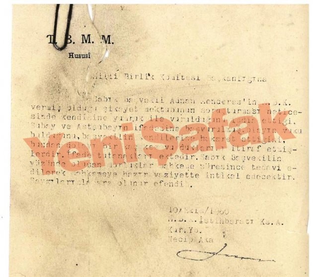 “Milli Birlik Komitesi Başkanlığı'na. Sabık Başvekilin dövülmesi olayı, azami ölçüde dikkat edilerek kapatılmıştır. Sabık Başvekile de bu konu ile ilgili beyanat vermeyeceğine dair söz alınmıştır. Saygılarımla arz ederim, efendim."