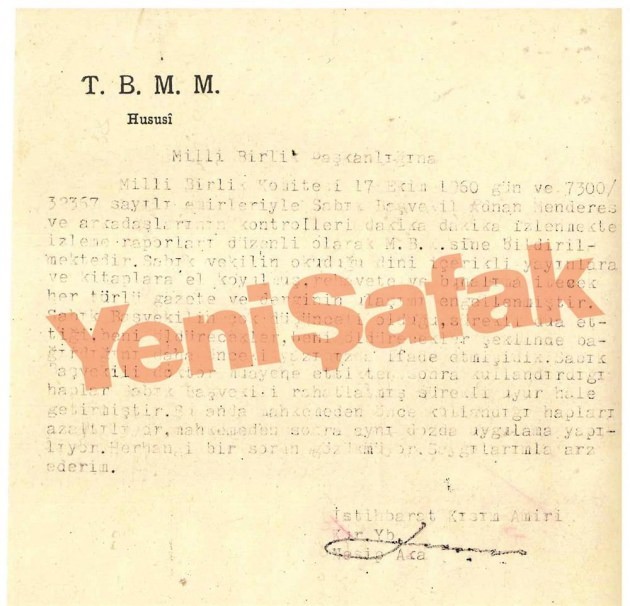 "Milli Birlik Komitesi 17 Ekim 1960 gün ve 7300 / 38367 sayılı emirleriyle Sabık Başvekil Adnan Menderes ve arkadaşlarının kontrolleri dakika dakika izlenmekte izleme raporları düzenli olarak M.B.K.sine bildirilmektedir. Sabık vekilin okuduğu dini içerikli yayınlara ve kitaplara el koyulmuş, rehavete ve bunalıma itecek her türlü gazete ve derginin ulaşımı engellenmiştir. Sabık Başvekilin çok düşünceli olduğu, sürekli dua ettiği, beni öldürecekler, beni öldürecekler şeklinde bağırdığını daha önceki yazımızda ifade etmişidik. Sabık Başvekili doktor muayene ettikten sonra kullandırdığı haplar Sabık Başvekili rahatlatmış sürekli uyur hale getirmiştir. Şu anda mahkemeden önce kullandığı hapları azaltılıyor, mahkemeden sonra aynı dozda uygulama yapılıyor. Herhangi bir sorun gözükmüyor. Saygılarımızla arz ederim."