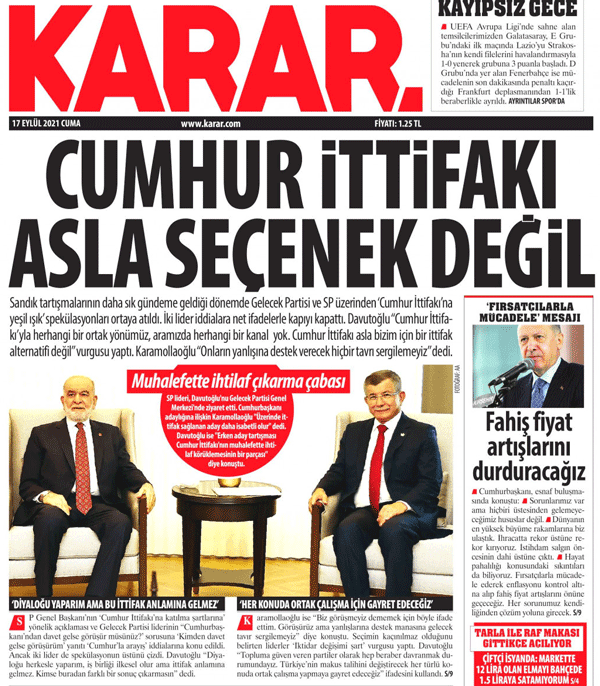 Son olarak bugün; merhum Başbakan Adnan Menderes’in idamının yıl dönümünde, vicdanları sızlatan bir gelişme yaşandı. Karar’ın manşetinden duyurduğu haberde, Gelecek Partisi Genel Başkanı Ahmet Davutoğlu ve Saadet Partisi Genel Başkanı Temel Karamollaoğlu’nun sözlerine yer verilerek, “Cumhur İttifakı asla seçenek değil” ifadeleri kullanıldı. Haberde Karamollaoğlu ve Davutoğlu’nun sözlerine yer verilerek, iki parti liderinin de Cumhur İttifakı’na kapıları tamamen kapattığı savunuldu.