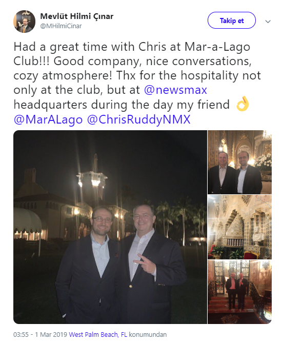 Teröritbaşı Gülen’in “sağ kolu” Mevlüt Hilmi Çınar’ın, Melaina Trump’ın DOVE School’a gerçekleştirdiği ziyaretten 3 gün önce, Donald Trump’ın inzivaya çekildiği “Kış Beyaz Evi” olarak bilinen sarayda ağırlandığı ortaya çıktı. Çınar, Trump’ın sarayında çektirdiği görüntüleri Twitter hesabından paylaşarak şu notu düştü: