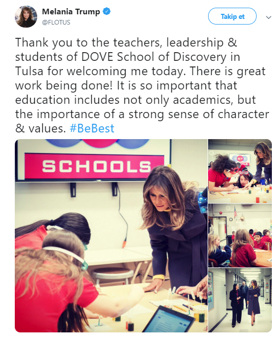 ABD Başkanı Donald Trump’ın eşi Melania Trump, iki gün önce, Fetullahçı Terör Örgütü’nün (FETÖ) ABD’deki sözleşmeli okullarından biri olan DOVE School’a ziyaret gerçekleştirmiş, okulu öve öve bitirememiş ve personeli yere göğe sığdıramamıştı. Melania Trump, Twitter hesabından yaptığı paylaşımda, “Beni misafir eden Tulsa’daki DOVE School’un öğretmenlerine ve öğrencilerine teşekkür ederim. Burada harika işler yapılıyor! Eğitim sadece akademiden ibaret değil, aynı zamanda güçlü bir karakter ve değer duygusunu da içermesi çok önemlidir” ifadelerini kullanmıştı.