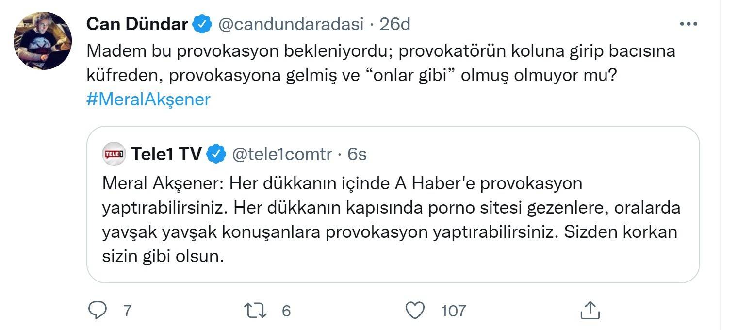 Sosyal medya hesabından bir paylaşımda bulunan Can Dündar, "Madem bu provokasyon bekleniyordu; provokatörün koluna girip bacısına küfreden, provokasyona gelmiş ve “onlar gibi” olmuş olmuyor mu?" diye sordu.
