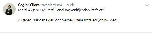 İYİ Parti Genel Başkanı Meral Akşener, partisinden istifa etti. Partisinin Afyon çalıştayında istifasını açıklayan Akşener'in "Bir daha geri dönmemek üzere gidiyorum" dediği öğrenildi. Meral Akşener'in resmi açıklama yapması bekleniyor. İYİ Parti'nin Genel Başkanı Merel Akşener 24 Haziran cumhurbaşkanlığı ve milletvekili genel seçimlerinde istenilen performansı gösterememiş. Cumhurbaşkanı seçiminde yüzde 7 oy oranına sahip olmuştu. Seçim sonuçlarının açıklanmasından sonra Meral Akşener'in İYİ Parti Genel Başkanlığından istifa edeceği söylenmişti. Meral Akşener parti yetkili oranlarının kendisinin genel başkanlığınındevam etmesi yönünde karar aldıklarını söylemişti.