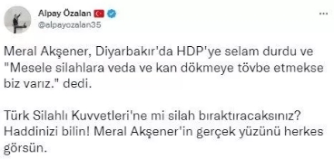 Özalan "Meral Akşener, Diyarbakır'da HDP'ye selam durdu ve "Mesele silahlara veda ve kan dökmeye tövbe etmekse biz varız." dedi. Türk Silahlı Kuvvetleri'ne mi silah bıraktıracaksınız? Haddinizi bilin! Meral Akşener'in gerçek yüzünü herkes görsün" dedi.