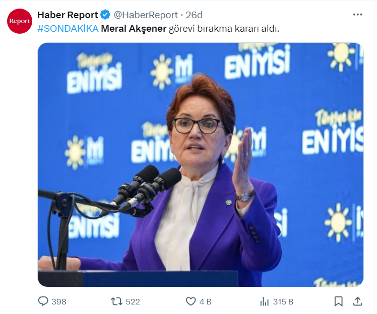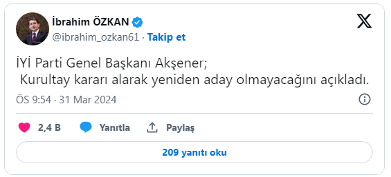 İbrahim Özkan, X hesabından yaptığı açıklamada şunları söyledi; "İYİ Parti Genel Başkanı Akşener; Kurultay kararı alarak yeniden aday olmayacağını açıkladı."