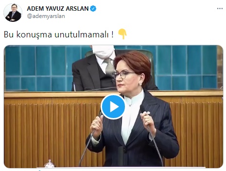 Akşener'in tepki toplayan bu sözleri karşısında zevkten dört köşe olan FETÖ firarisi Adem Yavuz Arslan söz konusu görüntüleri "Bu konuşma unutulmamalı" notuyla sosyal medya hesabından paylaştı.