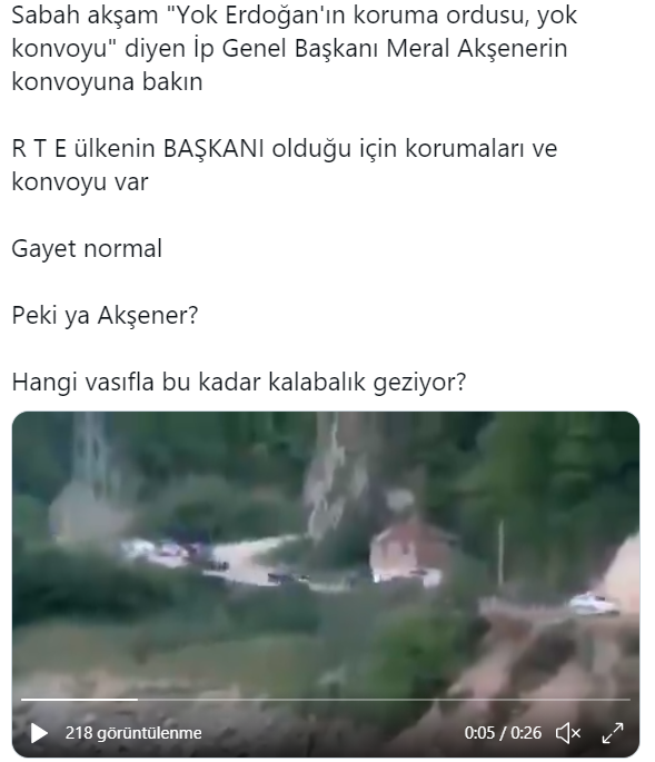 Sosyal medya kullanıcıları tarafından suçüstü yakalanan Akşener'in ondan fazla araçla konvoy oluşturması eleştirilere sebep oldu: Recep Tayyip Erdoğan ülkenin Başkanı olduğu için korumaları ve konvoyu var. Gayet normal. Peki ya Akşener? Hangi vasıfla bu kadar kalabalık geziyor?