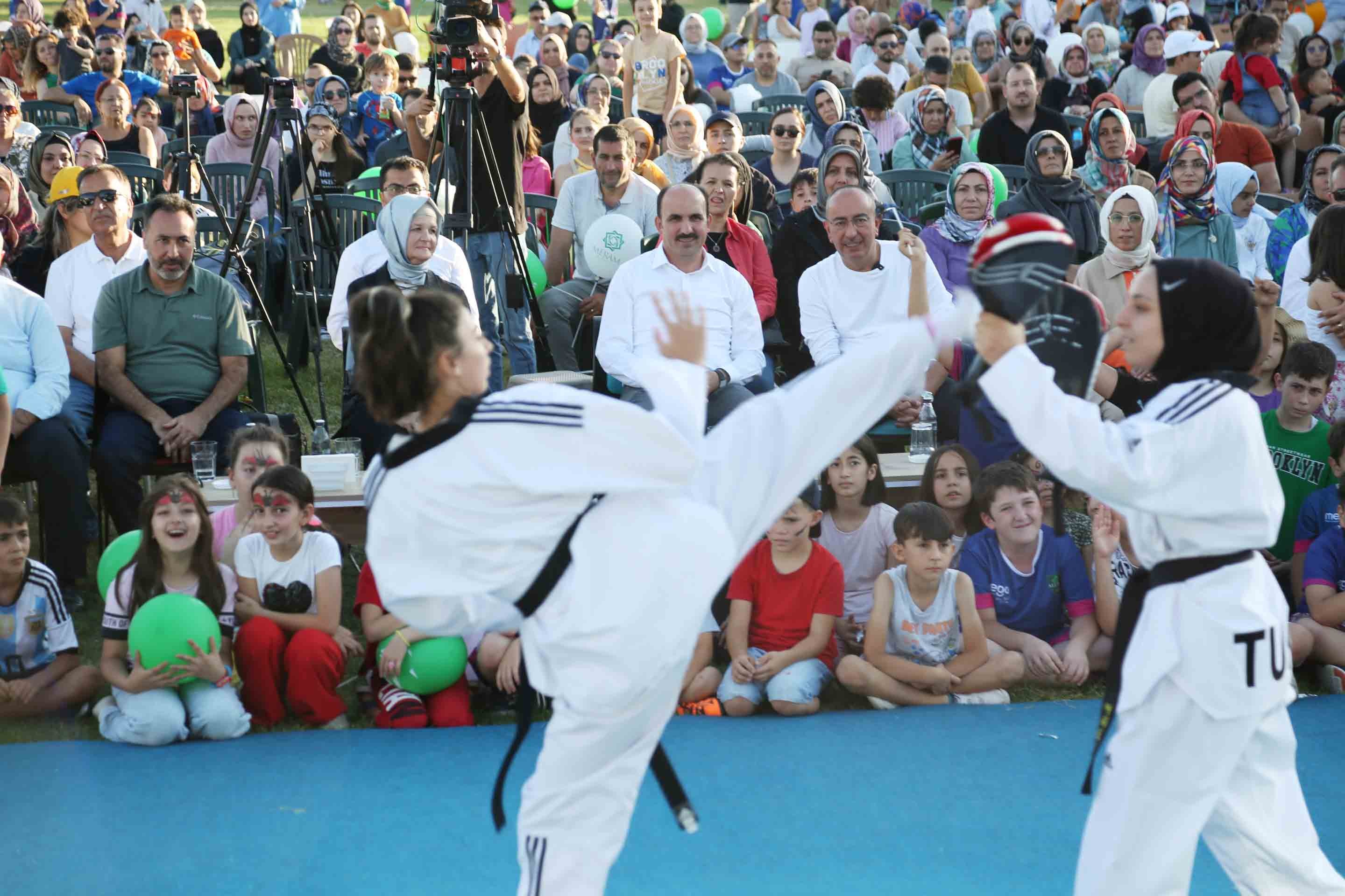 Meram Yaz Spor Okulları’nın kapanış programına katılan binlerce çocuk, şişme oyun grubu, palyaço, illüzyon, akıl zeka oyunları, müzikaller, sahne şovları, yarışmalarla doyumsuz bir gece yaşadı. Çocuklar kendileri için hazırlanan stantlarda gönüllerince eğlenirken spor okulu öğrencilerinin hazırladığı gösteriler de büyük alkış aldı. Programa katılan protokol, yaz spor okulu öğrencilerinin eğlence ve neşesine ortak oldu. Çocukların akıl zeka oyunları, balık tutma, halka atma, denge oyunu ve wooden bowling gibi oyunlarına eşlik eden protokol üyeleri, çocuklar ve aileleriyle de bol bol hatıra fotoğrafı çektirdiler. Dondurma, kek ve meyve suyu ikramının da olduğu program geç saatlere kadar devam etti.