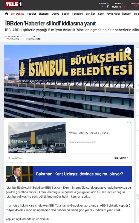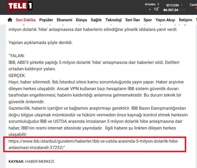 Merdan Yanardağ’ın Tele 1’inde, “İBB, ABD’li şirketle yaptığı 5 milyon dolarlık ‘hibe’ anlaşmasına dair haberleri sildi.” haberini yalanlamıştı. Ancak, yaptıkları yalanlamanın kendisi de yalan çıktı.