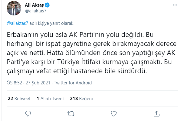 Milli Görüş Lideri merhum Erbakan'ın adını kullanarak Cumhurbaşkanı Erdoğan'ı hedef alan Aktaş, "Erbakan’ın yolu asla AK Parti'nin yolu değildi. Bu herhangi bir ispat gayretine gerek bırakmayacak derece açık ve netti. Hatta ölümünden önce son yaptığı şey AK Parti'ye karşı bir Türkiye İttifakı kurmaya çalışmaktı. Bu çalışmayı vefat ettiği hastanede bile sürdürdü." dedi.