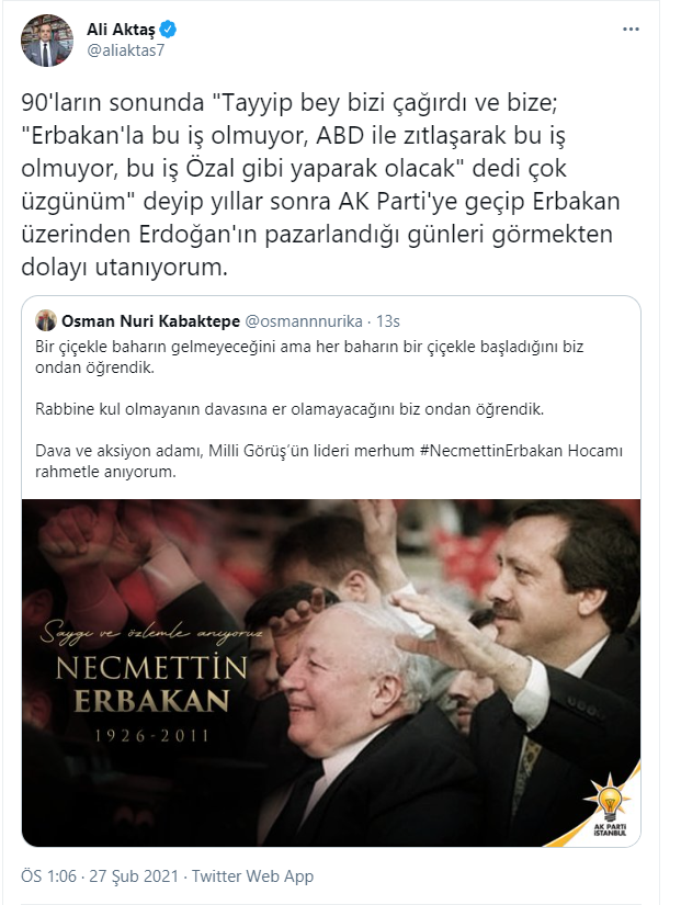 Bir diğer paylaşımında ise Cumhurbaşkanı Recep Tayyip Erdoğan'ın AK Parti'yi kurmadan önce kendilerini çağırdığını iddia eden Aktaş, "90'ların sonunda Tayyip bey bizi çağırdı ve bize; 'Erbakan'la bu iş olmuyor, ABD ile zıtlaşarak bu iş olmuyor, bu iş Özal gibi yaparak olacak. Çok üzgünüm' dedi. Yıllar sonra AK Parti'ye geçip Erbakan üzerinden Erdoğan'ın pazarlandığı günleri görmekten dolayı utanıyorum." diye konuştu.