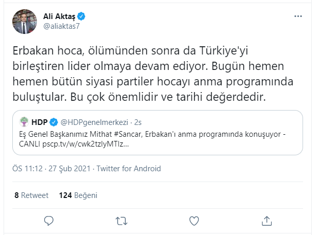 Aktaş, Necmettin Erbakan'ın oğlu Fatih Erbakan'ın çağrılmadığı anma etkinliğine terör sevici HDP'nin katılmasından duyduğu memnuniyeti şöyle ifade etti: