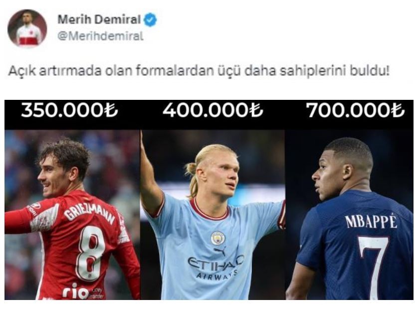 Merih Demiral'ın son olarak açık artırmaya çıkardığı Griezmann, Haaland ve Mbappe formaları 1 milyon 450 bin liraya satıldı. Merih'in kampanyasından deprem bölgesine aktarılan toplam tutar 9 milyon liraya ulaştı.