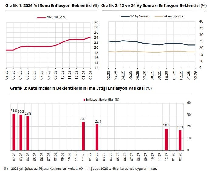 TCMB, Şubat 2026 dönemine ilişkin Piyasa Katılımcıları Anketi verilerini açıkladı. Buna göre, piyasa katılımcılarının cari yıl sonu tüketici enflasyonu beklentisi bir önceki anket döneminde yüzde 23,23 iken, bu anket döneminde yüzde 24,11 oldu. 12 ay sonrası enflasyon beklentisi bir önceki anket döneminde yüzde 22,20 iken, bu anket döneminde yüzde 22,10 oldu. 24 ay sonrası enflasyon beklentisi ise bir önceki anket döneminde yüzde 16,94 iken, bu anket döneminde yüzde 17,11 olarak gerçekleşti.