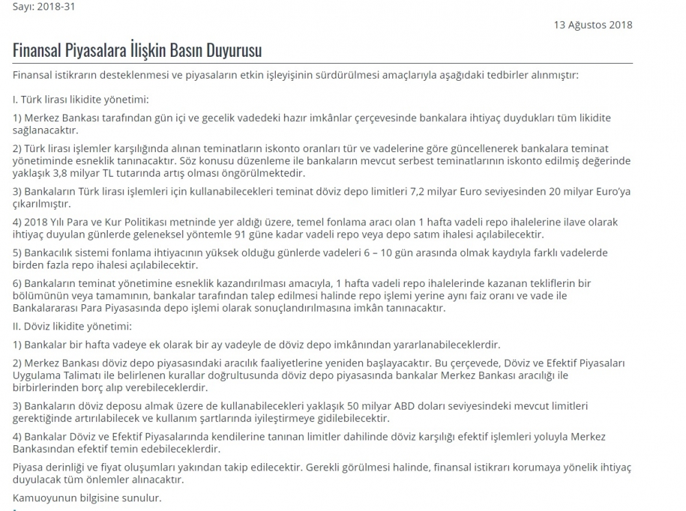 "Finansal istikrarın desteklenmesi ve piyasaların etkin işleyişinin sürdürülmesi amaçlarıyla aşağıdaki tedbirler alınmıştır: