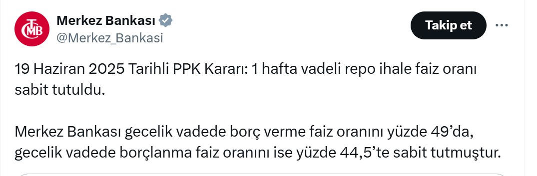 Türkiye Cumhuriyet Merkez Bankası, haziran ayına ilişkin kritik faiz kararını açıkladı. Nisan ayında politika faizini 350 baz puan artırarak yüzde 46 seviyesine çıkaran Merkez Bankası’nın bu ay gecelik vadede borç verme faiz oranını yüzde 49’da, gecelik vadede borçlanma faiz oranını ise yüzde 44,5’te sabit tutmuştur.