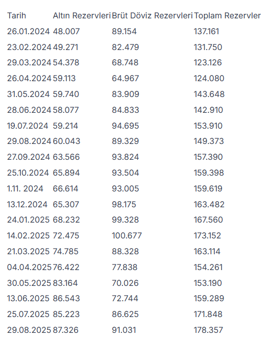 TCMB rezervleri, Ocak 2024'ten bu yana şöyle (milyon dolar):