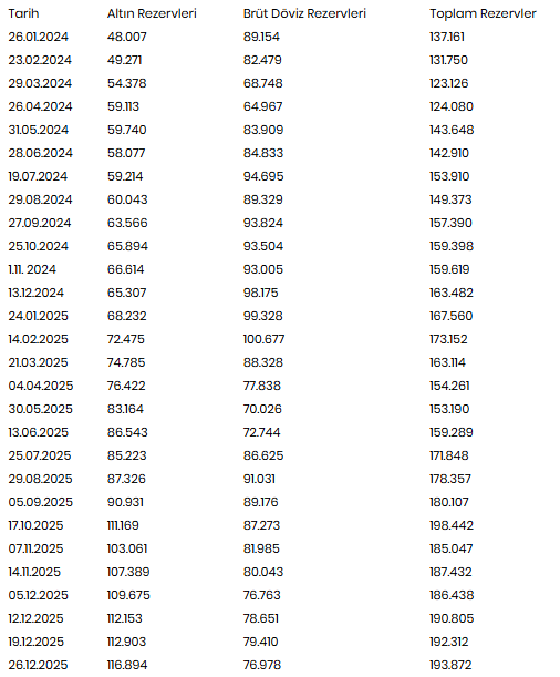 Buna göre, 26 Aralık itibarıyla Merkez Bankası brüt döviz rezervleri 2 milyar 432 milyon azalarak 76 milyar 978 milyon dolara indi. Brüt döviz rezervleri, 19 Aralık'ta 79 milyar 410 milyon dolar seviyesinde bulunuyordu.