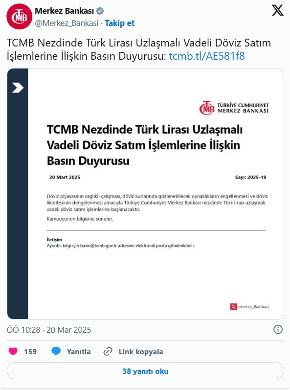 Merkez'in açıklamasında "Döviz piyasasının sağlıklı çalışması, döviz kurlarında gözlenebilecek oynaklıkların engellenmesi ve döviz likiditesinin dengelenmesi amacıyla Merkez Bankası nezdinde Türk lirası uzlaşmalı vadeli döviz satım işlemlerine başlanacaktır" denildi.