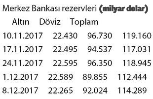 Merkez Bankası Para Politikası Kurulu kararını beklerken Merkez Bankası rezerv değişimi geldi. 1 Aralık haftasında 6.5 milyar dolarlık rezerv kaybına uğrayan Merkez Bankası 8 Aralık haftasında ise rezervini 1.8 milyar dolar artırmayı başlardı. 2.1 milyar dolarlık döviz rezervi artışı yaşanırken altın rezervlerinde 324 milyon dolarlık kayıp var.