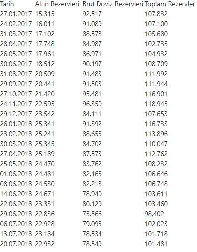 TCMB rezervleri tarihler itibarıyla şöyle (milyon dolar):