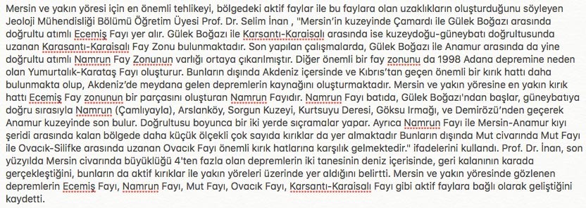 Jeoloji Mühendisleri Odası Mersin Şube Başkanı Erkan, Mersin’in deprem bölgesi olduğuna dikkat çekerek, “DemirMersin olası bir deprem koşulundan zemin noktasında çok kötü. Yani yapılaşmanın olduğu bölge alüvyon dediğimiz; Toros Dağlarının denize paralel olmasıyla ve akarsularının çakıl kum taş dediğimiz kötü malzemeden oluşuyor. Bizim kent merkezi diye tanımladığımız Pozcu’su, Viranşehir’i, Mezitli’si, Davultepesi’ne kadar oluşan kıyı şeridi. Buralar ova olan yerler ve tarım için verimli yerler. Mersin’in bir de şöyle bir dezavantajı var: sadece Mersin içindeki fay hatlarından değil Mersin’in çevresindeki Türkiye’yi etkileyen Doğu Anadolu Fay hattı, ya da Ecemiş’in uzantısı olan Orta Anadolu fay hattı, Ölü Deniz dediğimiz Güney’de Arabistan’dan başlayan 1000 km’lik bir fay hattı kuşağının etkisi altında. Doğal olarak bu bölgede yaşanılacak bir deprem Mersin’in kıyı şeridinden kaynaklı yıkıcı bir etkiye sebep olacak.” diye konuştu.