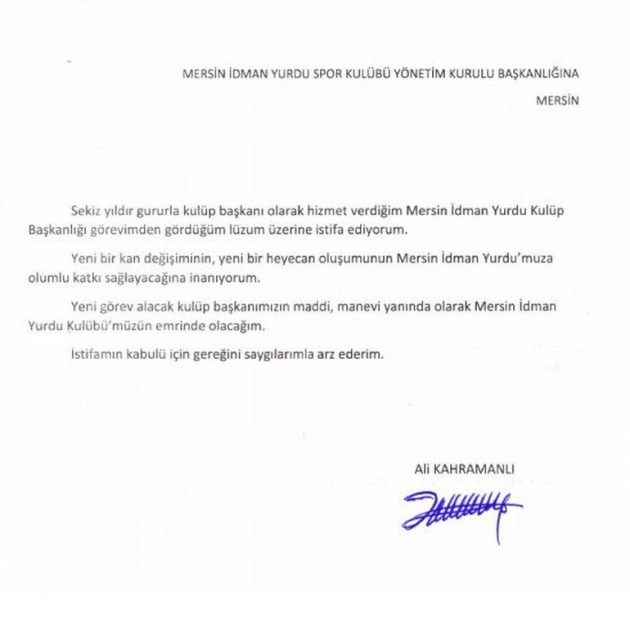 Bülent Korkmaz'ın çalıştırdığı Süper Lig'de 10 puanı bulunan ve 17. sırada olan Mersin İdman Yurdu'nda Başkan Ali Kahramanlı görevinden istifa etti. İşte kulüpten gönderilen açıklama;