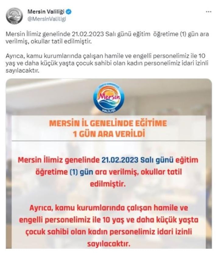 Twitter hesabından açıklama yapan Mersin Valiliği, "Mersin İlimiz genelinde 21.02.2023 Salı günü eğitimöğretime (1) gün ara verilmiş, okullar tatil edilmiştir. Ayrıca, kamu kurumlarında çalışan hamile ve engelli personelimiz ile 10 yaş ve daha küçük yaşta çocuk sahibi olan kadın personelimiz idari izinli sayılacaktır." ifadelerini kullandı.