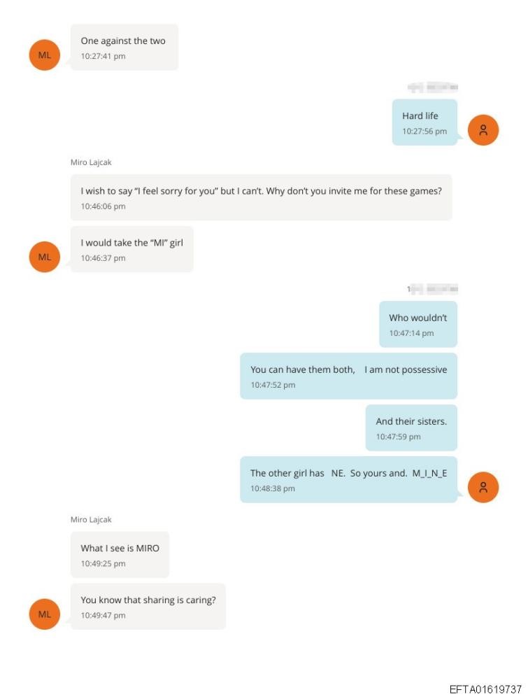 ABD Adalet Bakanlığı’ndan yayınlanan yaklaşık 3 milyon sayfalık belgelerde Ekim 2018 tarihinde Lajcak ve Eptstein arasında kadınlar ve Slovak diplomatın Rusya Dışişleri Bakanı Sergey Lavrov ile yakın zamanda gerçekleştireceği görüşmeye ilişkin yazışmalar yer aldı. Epstein’in Lajcak’a gönderdiği belgelerde belirtilmeyen fotoğraflı mesajın ardından Slovak siyasetçinin, "Neden beni bu tür oyunlara davet etmiyorsun" diye sorduğu kaydedildi.