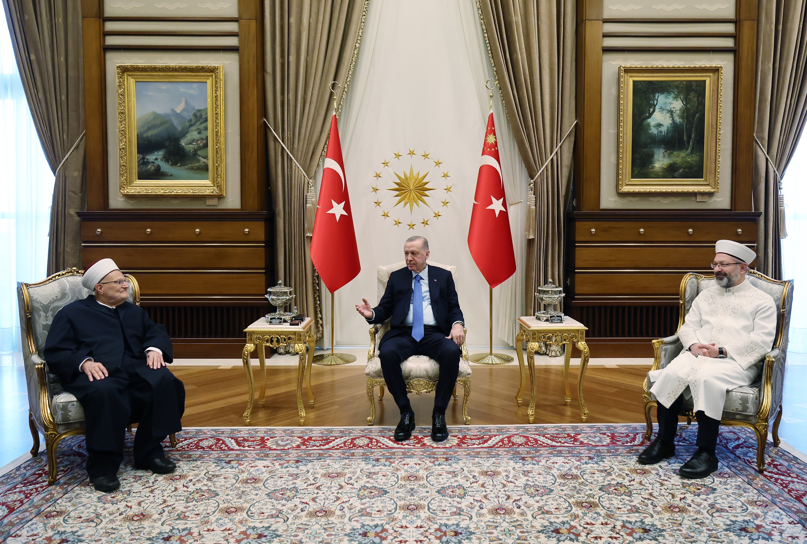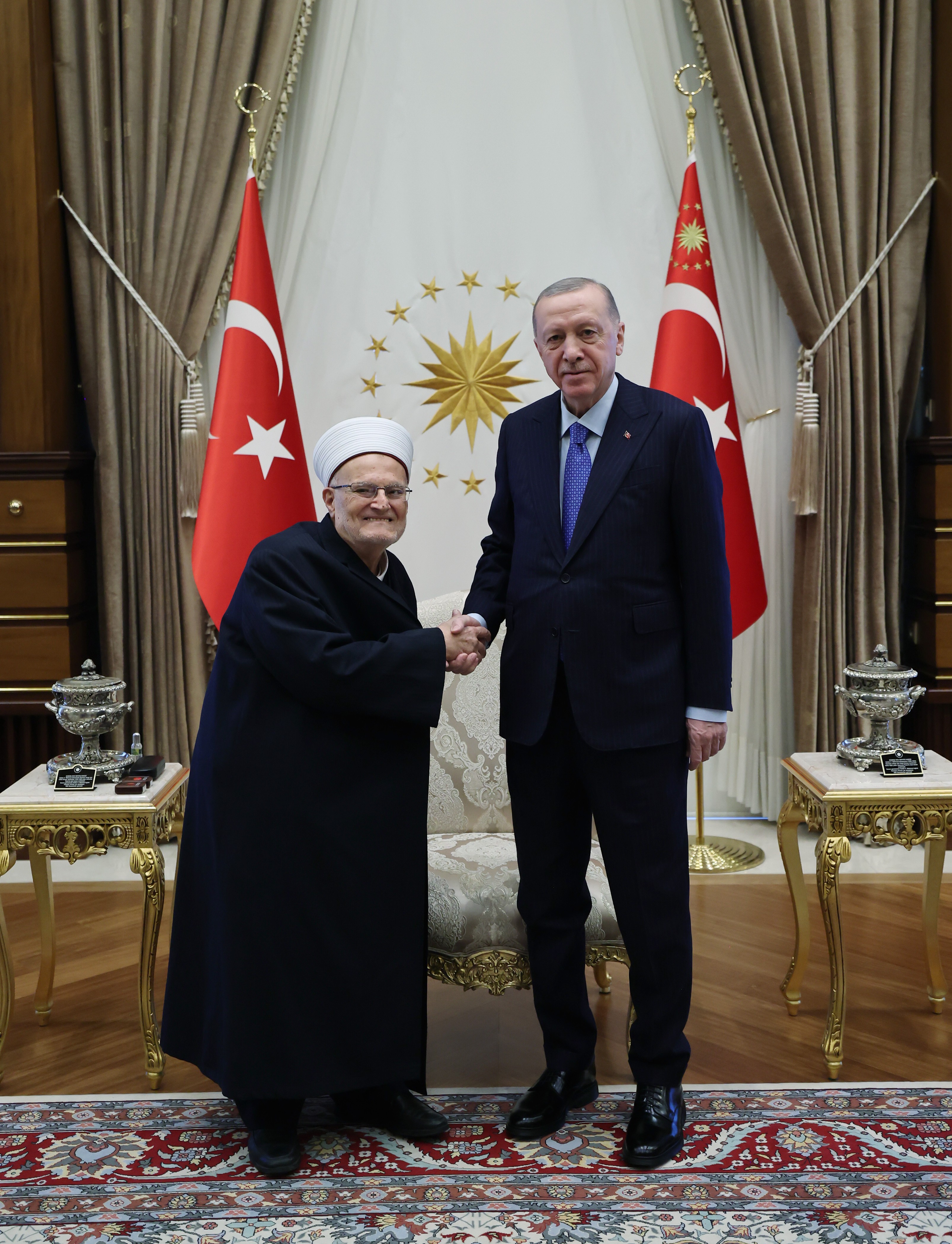 Cumhurbaşkanı Recep Tayyip Erdoğan, Mescid-i Aksa İmam Hatibi Şeyh İkrime Sabri'yi Cumhurbaşkanlığı Külliyesi'nde kabul etti.