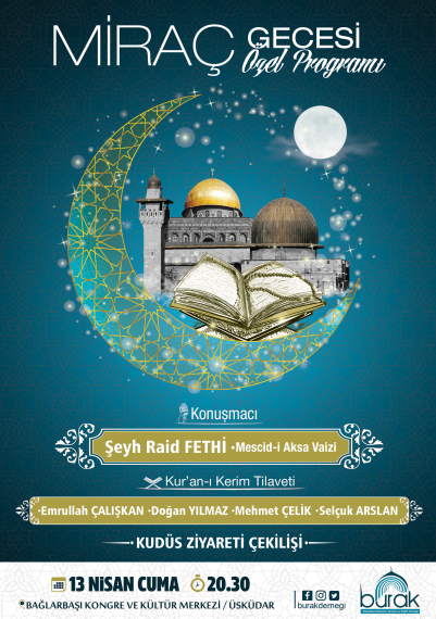 Burak Derneği tarafından Bağlarbaşı Kongre ve Kültür Merkezi'nde bu akşam Miraç Gecesi Özel Programı gerçekleştirilecek. Saat 20.30'da başlayacak olan programda Emrullah Çalışkan, Doğan Yılmaz, Mehmet Çelik ve Selçuk Arslan Kur'an-ı Kerim tilaveti verecek.