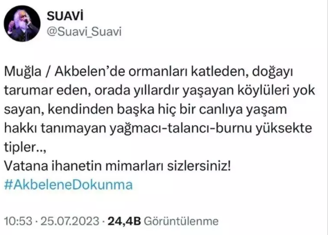 CHP yandaşı Suavi, Akbelen'le ilgili 2023'te yaptığı paylaşımda "Akbelen'de ormanları katleden, doğayı tarumar eden, orada yıllardır yaşayan köylüleri yok sayan, kendinden başka hiçbir canlıya yaşam hakkı tanımayan yağmacı-talancı-burnu yüksekte tipler. Vatana ihanetin mimarları sizlersiniz!" demişti.